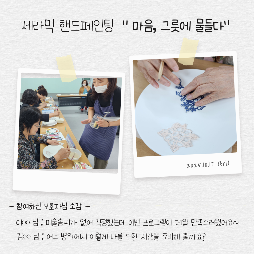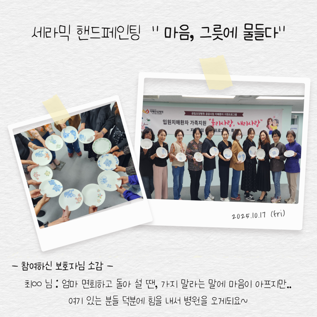 | 830 | 10/17 º¸È£ÀÚ Èú¸µÇÁ·Î±×·¥ ÁøÇà | °ü¸®ÀÚ | 2025-10-21 | 450 |